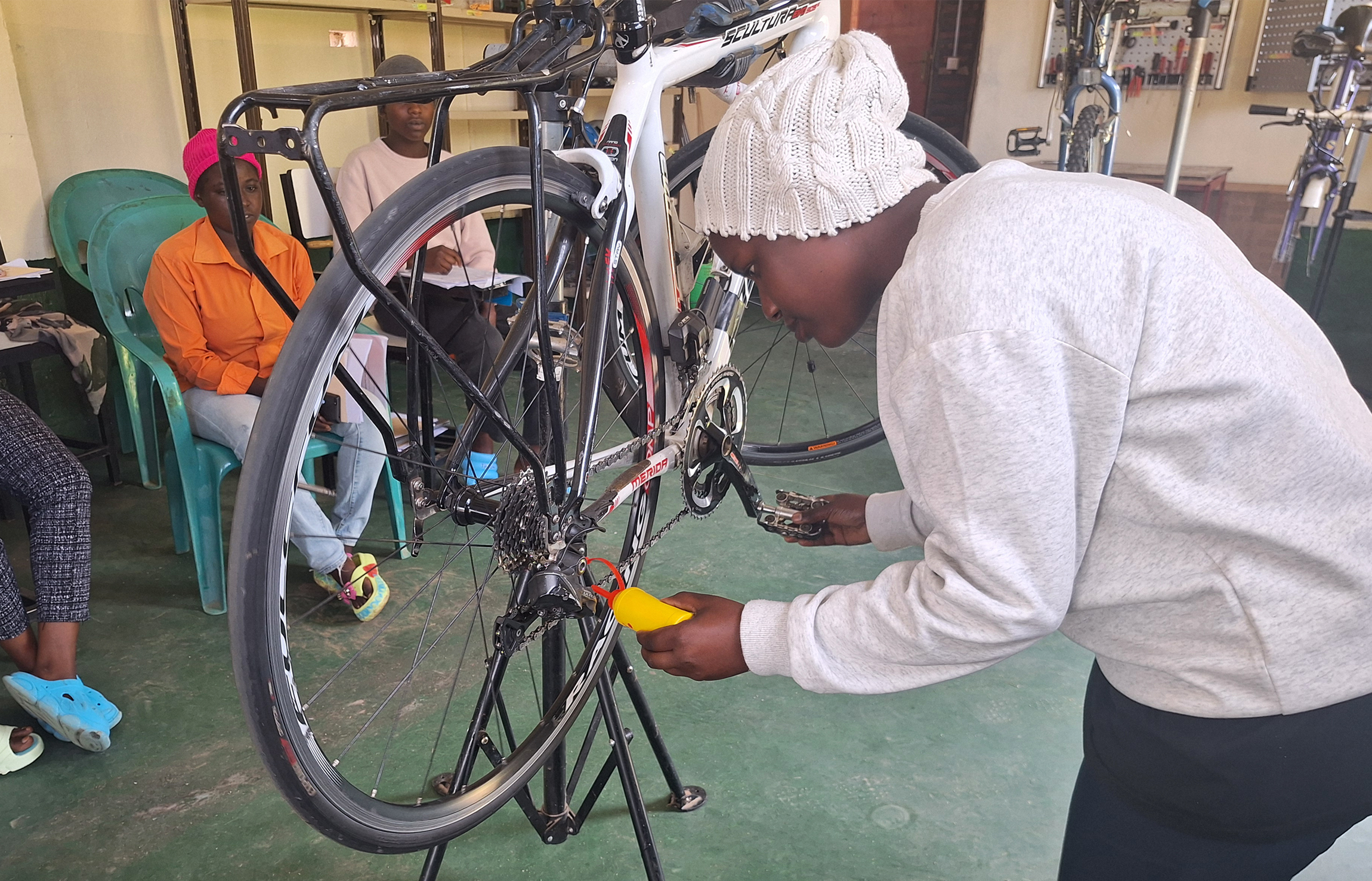 Amasaro project va dans ce sens, en permettant à des jeunes filles/femmes, mères ou non, de sortir de la précarité par l’acquisition d’un métier pour lequel les débouchés sont prometteurs. Amasaro a décidé de s’installer loin de Kigali, mais près des centres touristiques, au bord du lac Kivu, où la pratique du cyclisme est particulièrement favorable. Un local a été loué puis aménagé en atelier d’entretien de vélos où 15 jeunes femmes, présélectionnées, ont pu commencer la formation début janvier, encadrées par des professionnels qualifiés et expérimentés. Après un tri sévère, seules les plus motivées pourront arriver au bout de la formation de six mois et obtenir le diplôme de mécanicienne sur vélo. Il est prévu deux volées de 15 au maximum par année.